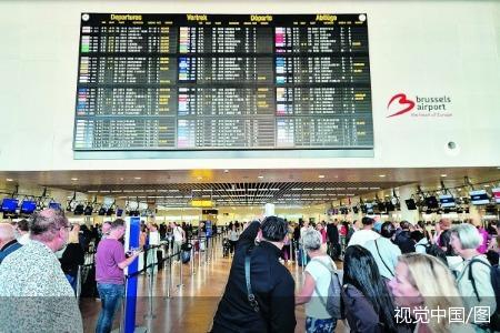 20日,布鲁塞尔机场,乘客们在值机区等候,旁边是航班信息显示屏。